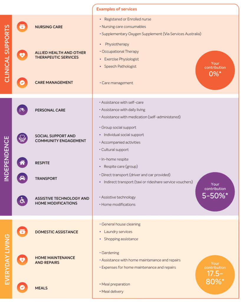 Home Care Package and Short-term Restorative Care services are now combined under the Government’s new Support at Home program. This reform brings 8 new classifications for ongoing services and 4 classifications for people transitioning from the Home Care Packages Program. Each classification will have a specific budget for participants to access services. These will depend on your individual situations e.g. whether you are a full or part pensioner or self-funded retiree. Older people applying for Support at Home services will first need to be assessed by My Aged Care.
